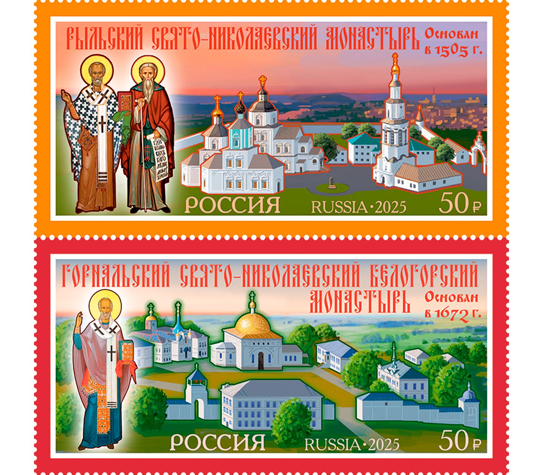 Продолжение серии «Монастыри Русской православной церкви» от 2025 года. В выпуск вошли 2 почтовые марки, на которых изображены Горнальский Свято-Николаевский Белогорский мужской монастырь и Рыльский Свято-Николаевский мужской монастырь.