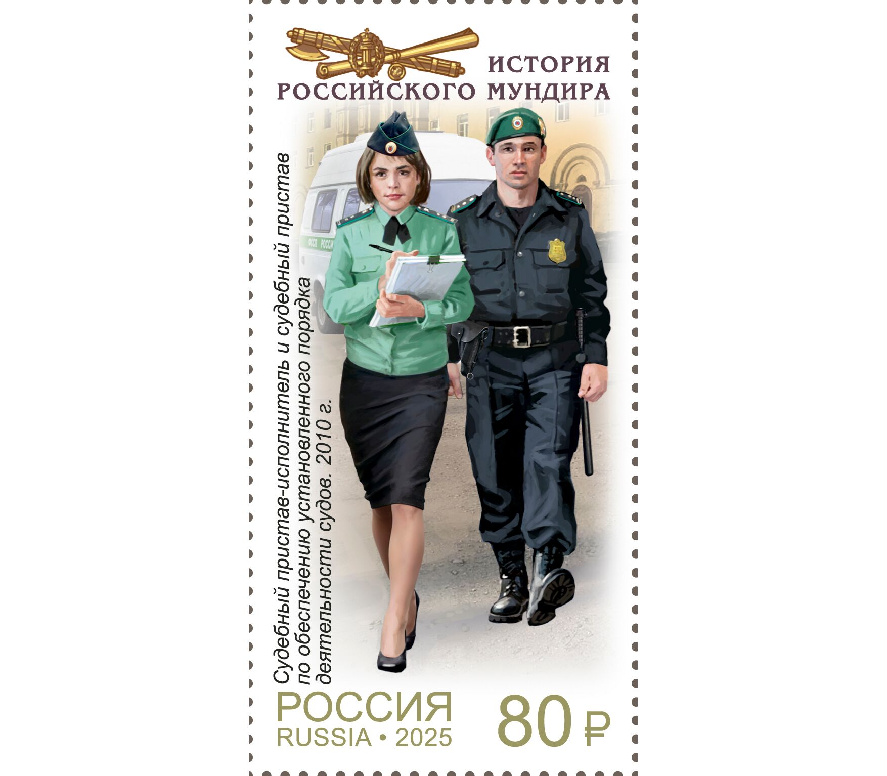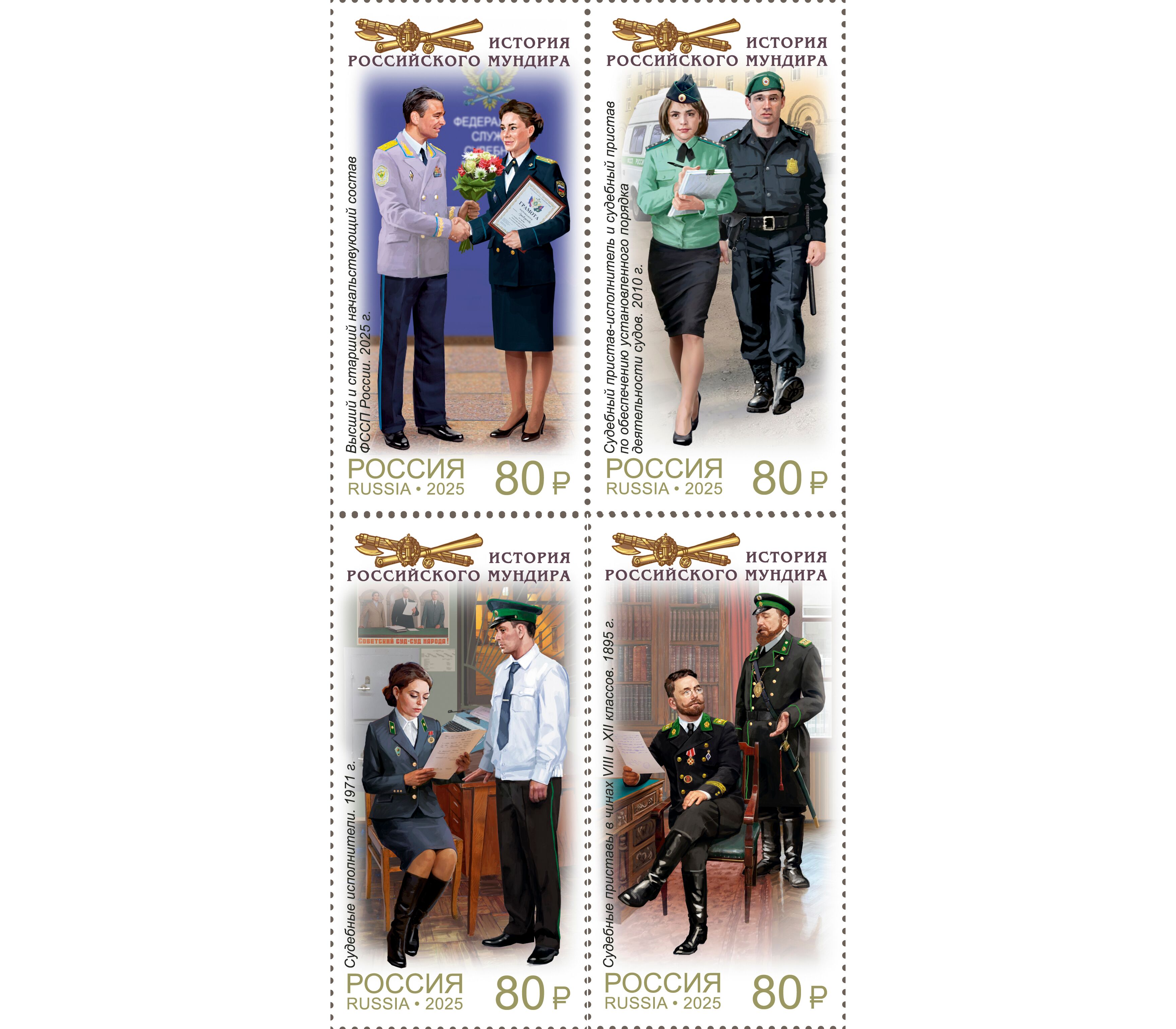 Продолжение серии российских марок «История российского мундира» 2025 года. На 4-х почтовых марках изображены сотрудники службы судебных приставов в официальной форме.