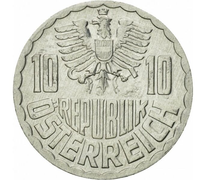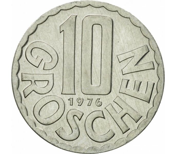 В наличии ходовая австрийская монета номиналом 10 грошей, выпущенная в 1976 году. Монета отчеканена из алюминия, вес составляет 1,1 грамм. Монета относится к периоду Второй Республики (1946 - 2001).