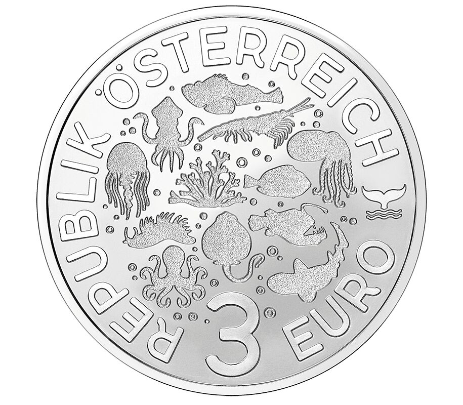 На одиннадцатой монете достоинством 3 евро из серии «Светящиеся морские миры» изображен голожаберный моллюск, чьи цвета меняются под воздействием ультрафиолета.