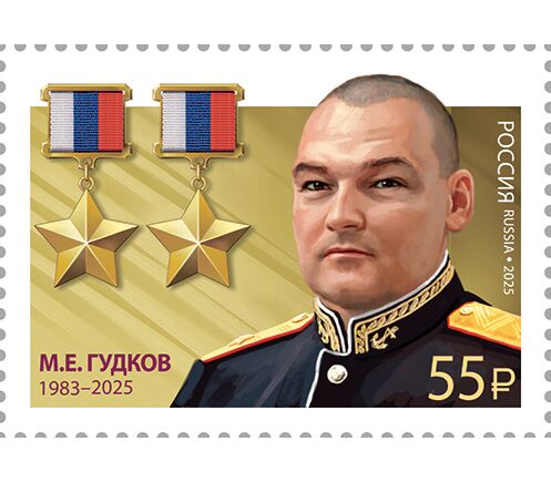 Почтовая марка 2025 года выпуска из памятной серии «Герои Российской Федерации». Выпуск посвящен заместителю главнокомандующего ВМФ России, генерал-майору Михаилу Евгеньевичу Гудкову.