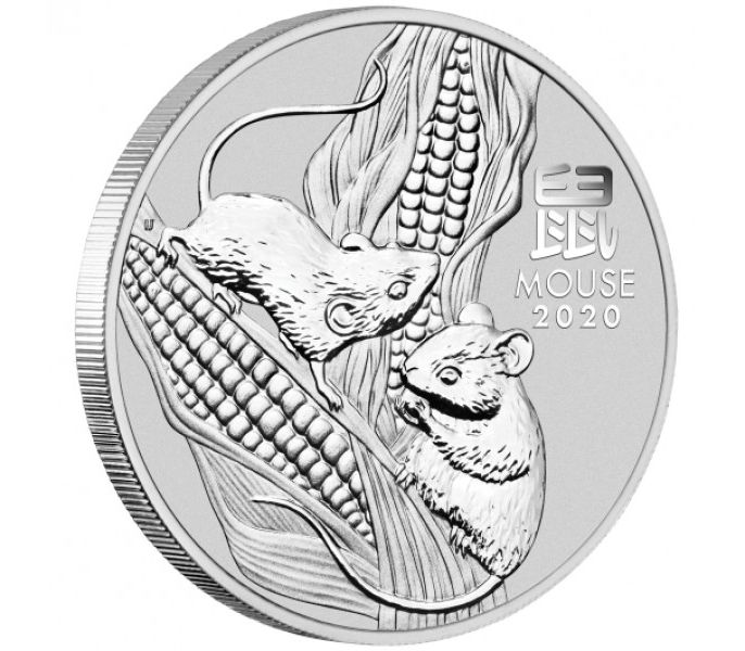 Монета, посвященная главному символу 2020 года по Восточному Гороскопу — мышке (или крысе). На реверсе монеты изображены два мышонка, сидящие на початках кукурузы.